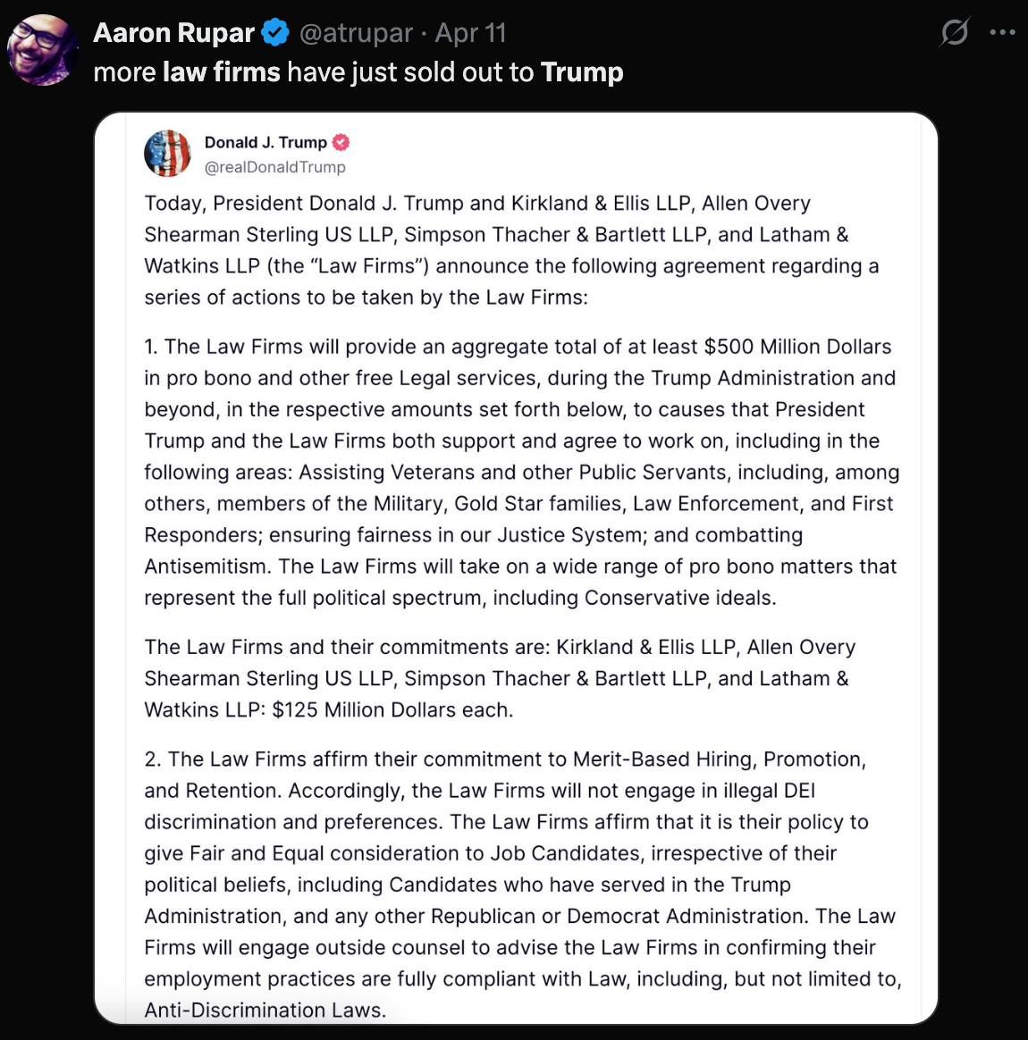 If targeting old colleagues wasn’t enough, Trump’s got America’s top law firms on a leash. He’s strong-armed giants like Kirkland & Ellis and Latham & Watkins into coughing up nearly $1 billion in free legal work to fuel his crusades. How? By threatening them with EOs that could strip their government contracts or bar them from federal buildings. Five firms just agreed to $600 million in pro bono work, on top of earlier deals. Some, like Jenner & Block, are fighting back, calling these orders unconstitutional, but most are folding.