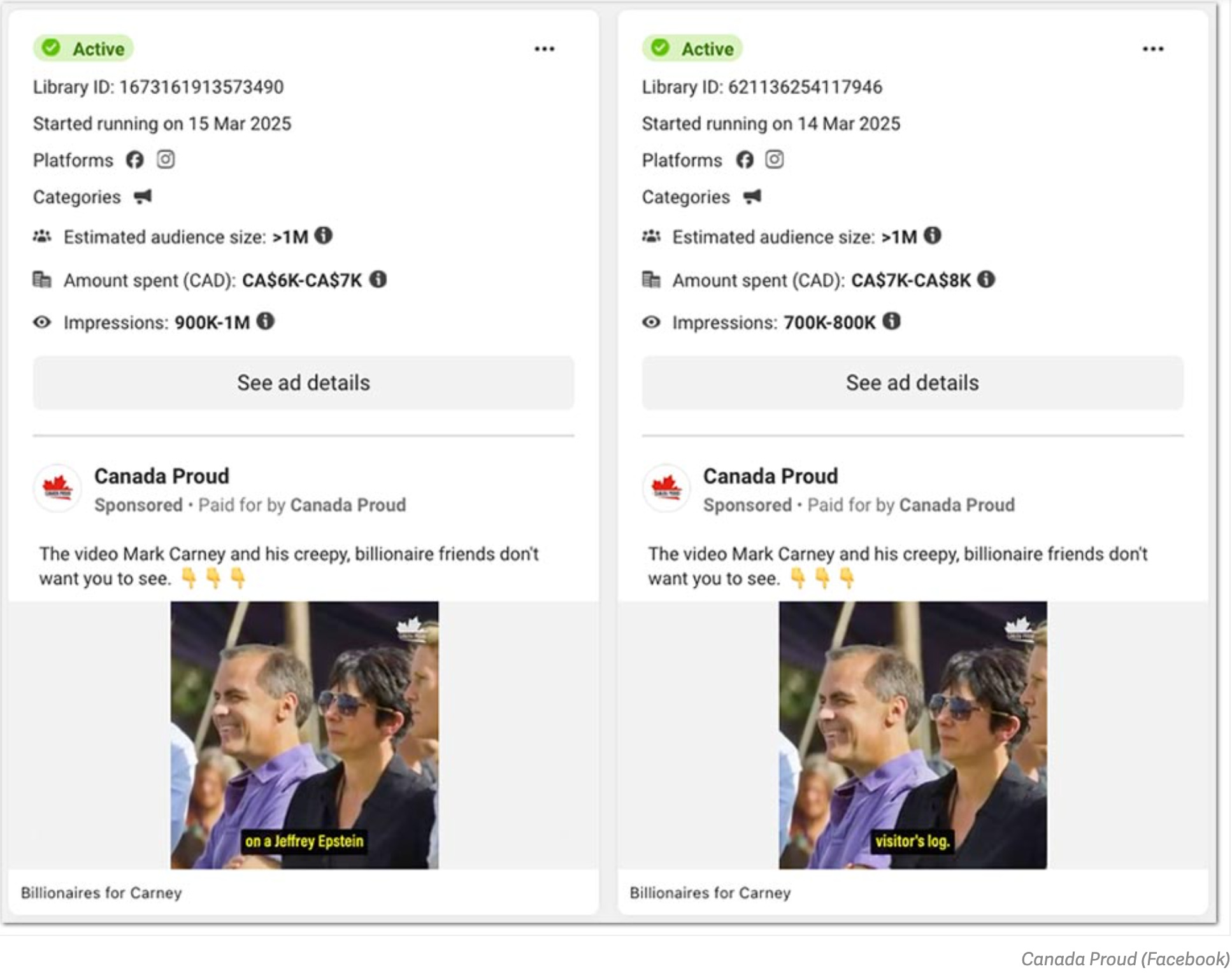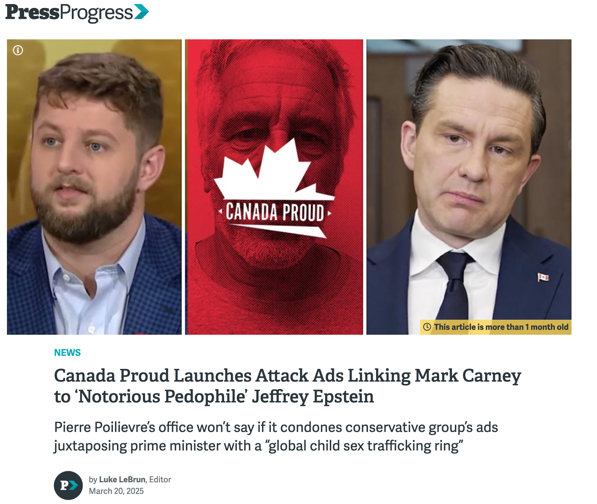 Canada Proud and Conservative influencers tied Carney to Jeffrey Epstein in paid attack ads, complete with dark photos, false insinuations, and Ghislaine Maxwell overlays. PressProgress covered it brilliantly.