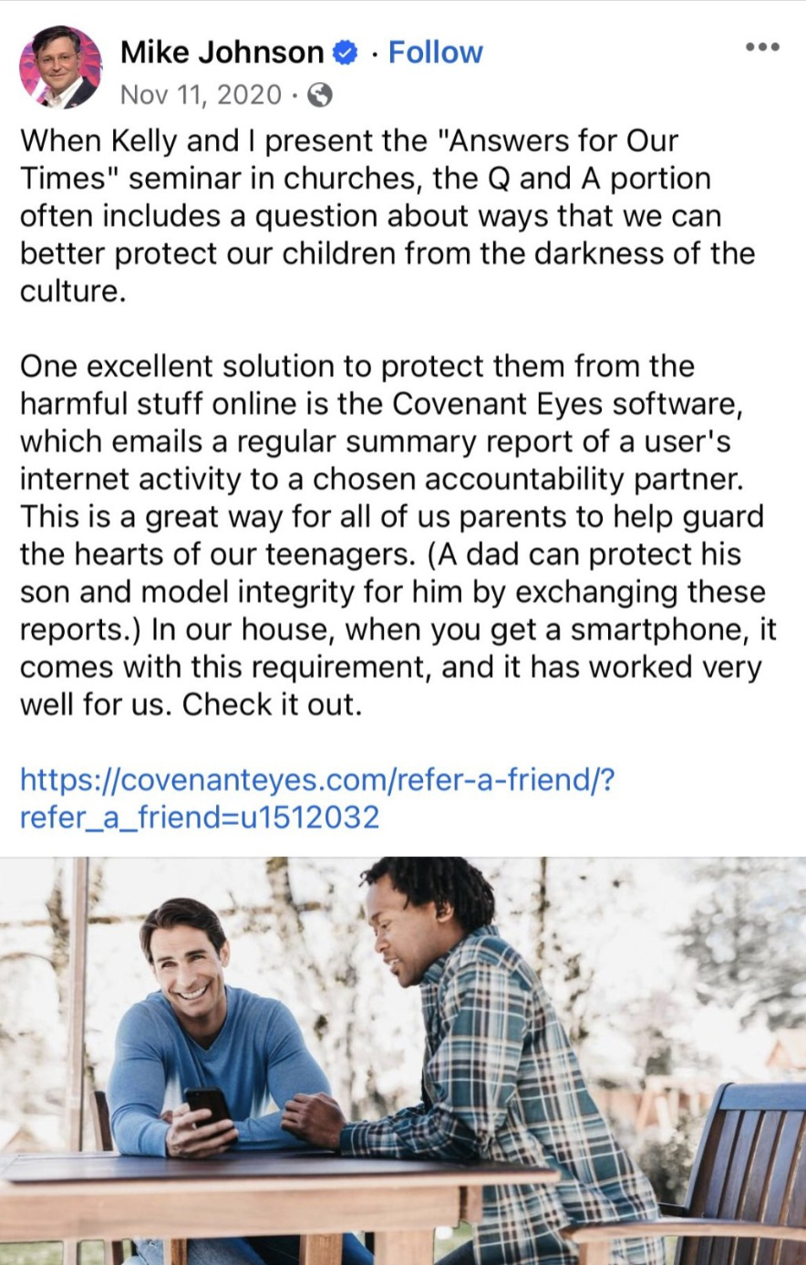 Let’s not forget Covenant Eyes, the evangelical porn-monitoring app Johnson uses with his son. Yep. That’s real, too. He got paid 20$ per signup, and he and his son used it to monitor each other’s porn use.