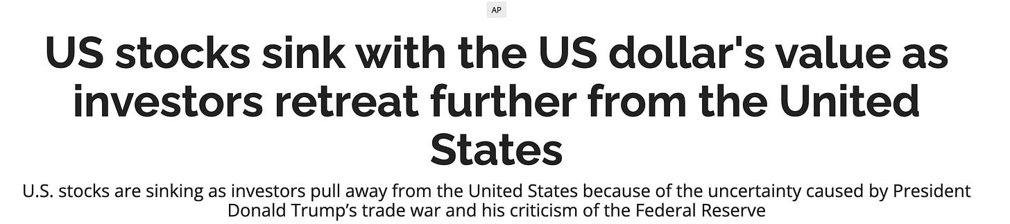Behind the bravado, Trump’s sweating bullets. Insiders say he’s been grilling aides about whether his tariffs could tank the economy into a Great Depression redux. “Ruinous,” he calls it, haunted by visions of breadlines and stock market crashes. Publicly, he’s still strutting like a peacock, but privately? The guy’s losing it, fully aware his trade war’s blowing up in his face. The U.S. dollar’s down 6% this year, Wall Street’s a mess, and there’s a “triple sell-off”—stocks, bonds, and the dollar all cratering together. That’s not a hiccup; that’s a heart attack.