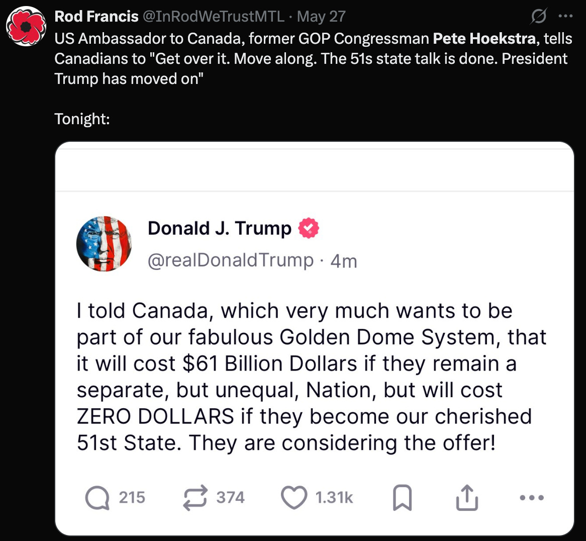 Over the May 24 weekend, Hoekstra appeared on CBC’s The House and told Canadians to “get over the 51st state thing,” insisting Trump was done joking about annexing Canada. Canadians had nothing to worry about, he implied. He and Trump would never bring it up again.