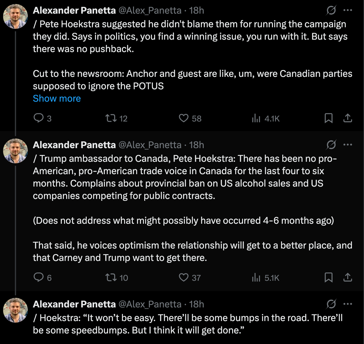 Hoekstra Spent the last four days gaslighting Canadians as "Anti- American" Lying About Trump "being done" with 51st State Threats