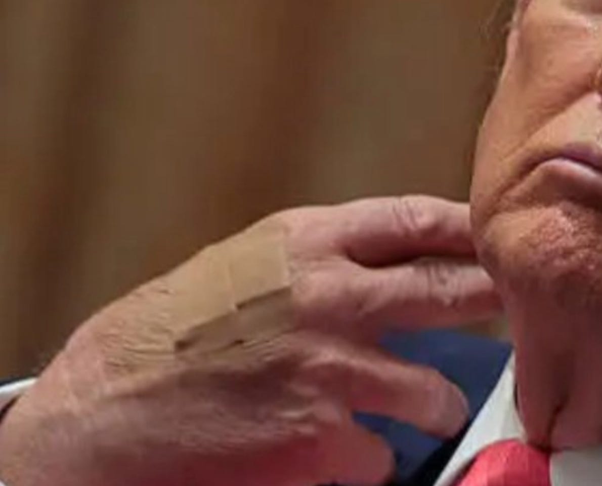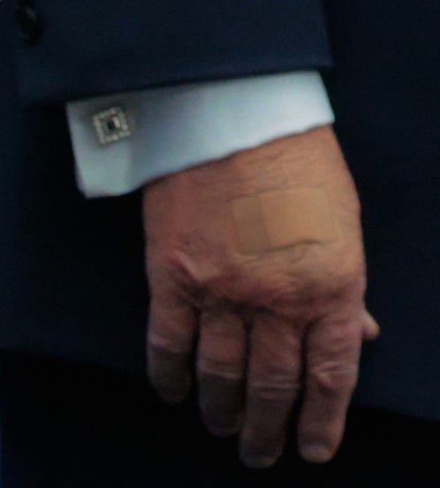 Trump’s mysteriously bruised hand — the one photographers have caught, caked with orange makeup and concealer — is exactly what patients look like after repeated IV infusions of Kisunla (donanemab), a monoclonal antibody drug for early symptomatic Alzheimer’s disease.