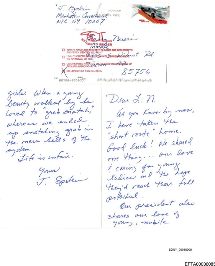 Among the most chilling artifacts resurfacing alongside DATA SET 8 is a handwritten Epstein letter to notorious pedophile Larry Nassar, effectively telling him that while Jeff and Larry didn’t get away with it, Trump did. Referencing: