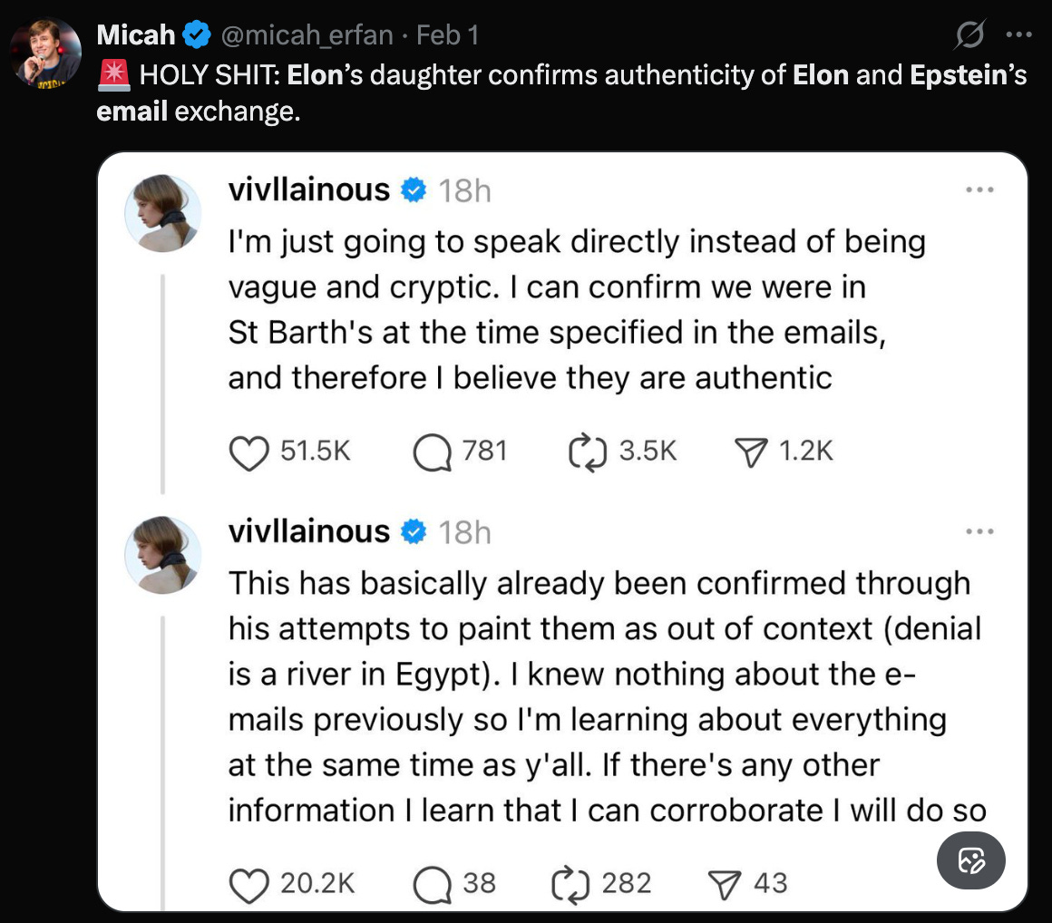 His daughter confirmed that Elon and Epstein were pals and Musk was absolutely a regular guest of Epstein (on the island and in NY).