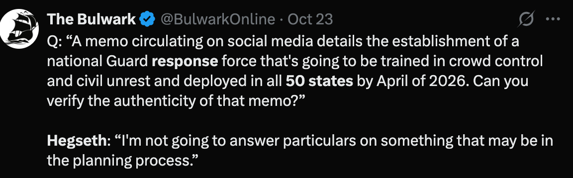 We’re watching a domestic security build‑out arrive on a calendar—training schedules, equipment lists, mobilization timelines—not a theory. And Hegseth Order targes all 50 States.
