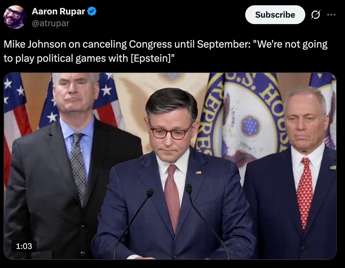 “Mike Johnson quit work early to give Trump space to deal with his Jeffrey Epstein problem.” — Emptywheel