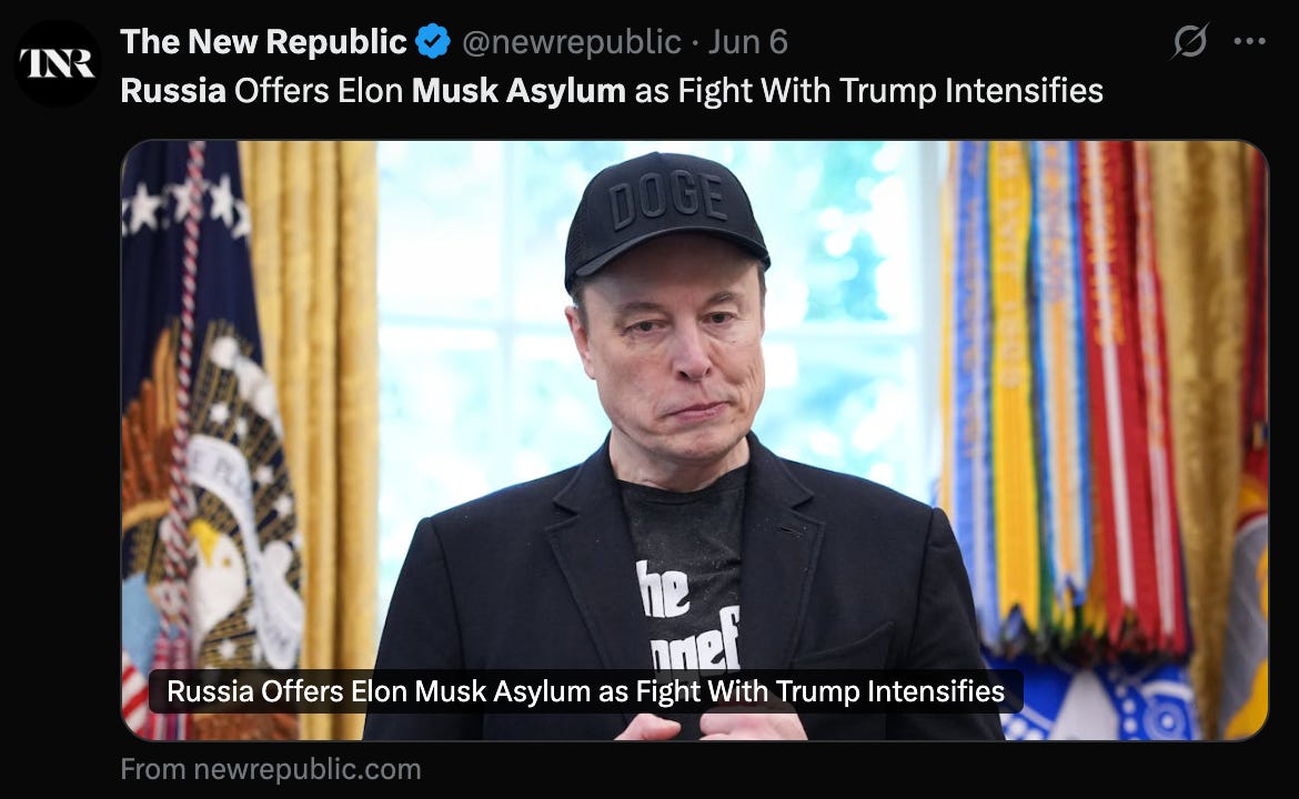 Russian Duma official Dmitry Novikov told state media that Russia could "certainly offer" Musk asylum—should he need it. The statement was sly. On its face: absurd. But beneath the satire, it was deadly serious geopolitical trolling.