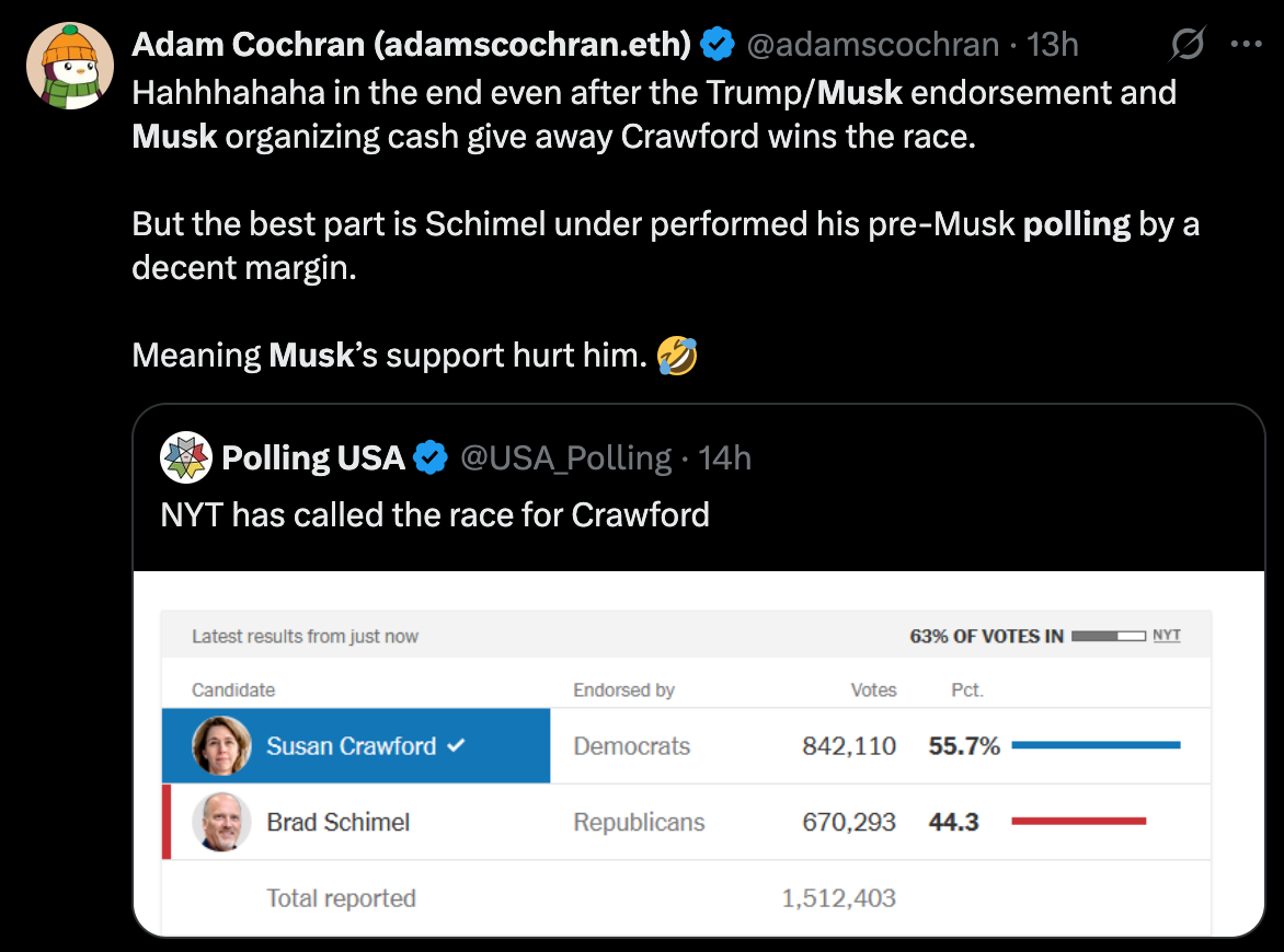 Musk went all-in on the Wisconsin Supreme Court race, backing conservative judge Brad Schimel against liberal Susan Crawford. He poured $21 million into the campaign, handed out $1 million checks to voters, and even showed up in a cheesehead hat to rally support. He called the race a battle for “the future of Western civilization,” hyping it up like it was the key to Trump’s entire agenda. Spoiler: it wasn’t. Crawford won by a solid 9 points, with a 191,000-vote margin, keeping the court’s 4-3 liberal majority intact.