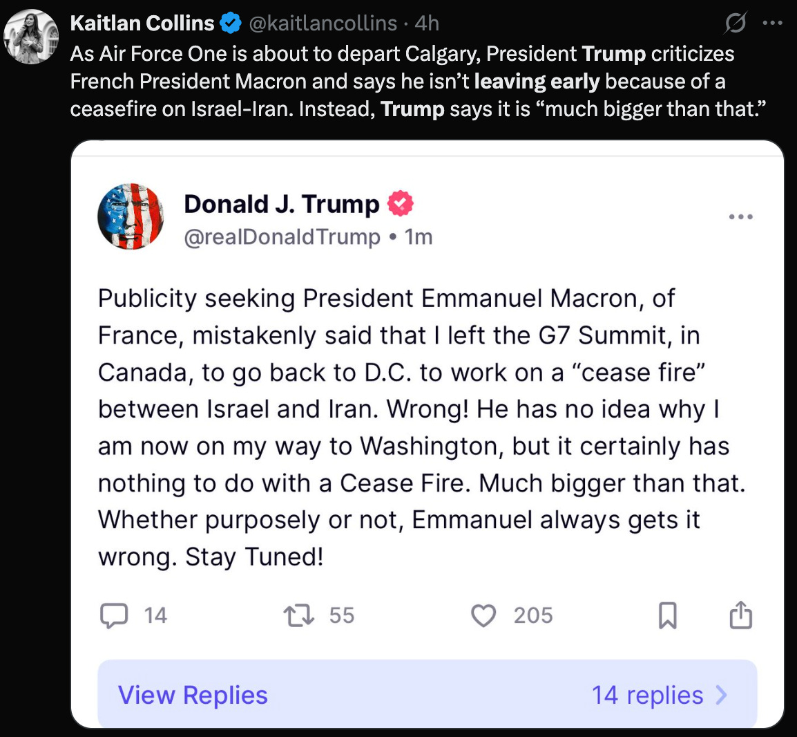 Macron diplomatically told reporters that Trump was heading home to work on a potential Iran ceasefire – an attempt to give the U.S. leader a statesmanlike excuse. But from Air Force One, Trump lashed out at Macron’s characterization, clearly irked by any suggestion that he’d been pressured by allies. “Wrong! He has no idea why I am now on my way to Washington,” Trump blasted, insisting his reason for leaving was “certainly not…a ceasefire” and “much bigger than that.”
