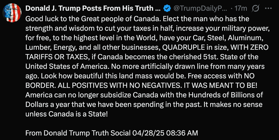 "Good luck to the Great people of Canada. Elect the man who has the strength and wisdom to cut your taxes in half, increase your military power, for free, to the highest level in the World, have your Car, Steel, Aluminum, Lumber, Energy, and all other businesses, QUADRUPLE in size, WITH ZERO TARIFFS OR TAXES, if Canada becomes the cherished 51st. State of the United States of America. No more artificially drawn line from many years ago. Look how beautiful this land mass would be. Free access with NO BORDER. ALL POSITIVES WITH NO NEGATIVES. IT WAS MEANT TO BE! America can no longer subsidize Canada with the Hundreds of Billions of Dollars a year that we have been spending in the past. It makes no sense unless Canada is a State!"