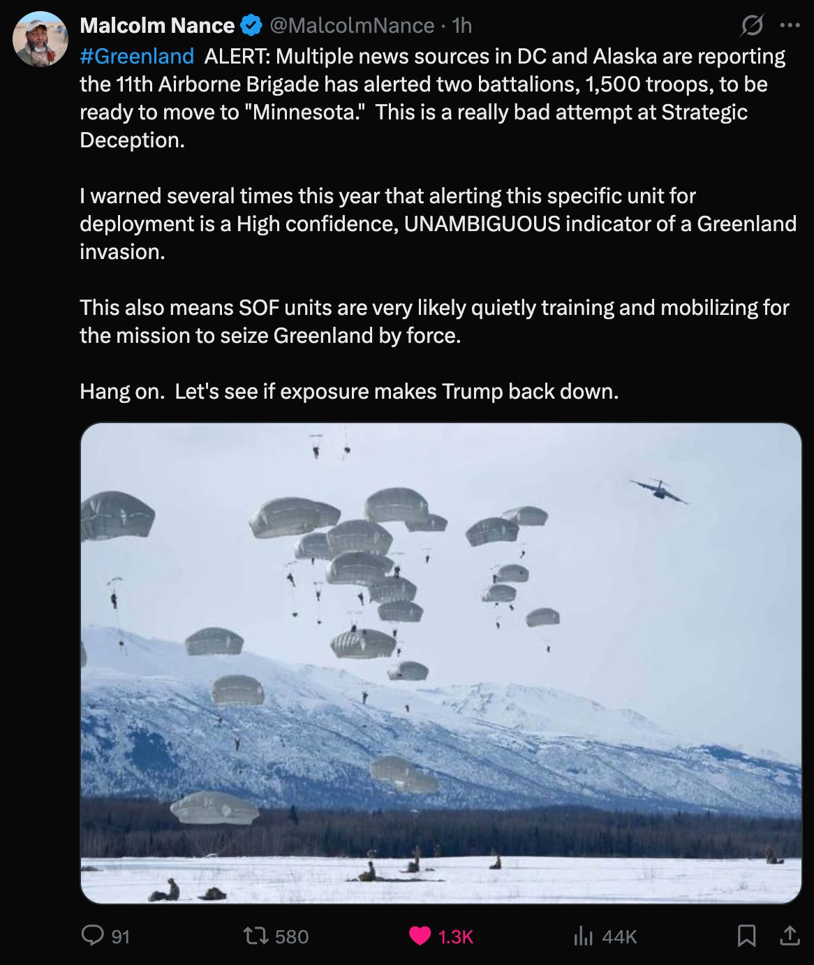 That deployment matters. “Minnesota” might be “Greenland” according to Black Man Spy - Malcolm Nance - the gateway to the Arctic. It is logistics. It is staging. It is not subtle.