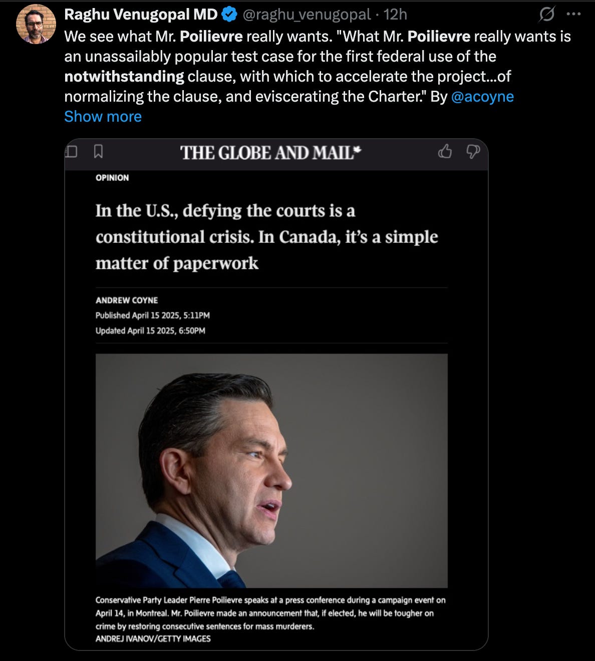 As Canada navigates this dual crisis, the stakes for the upcoming election could not be higher. A vote for Poilievre, critics argue, is a vote for a leader who may capitulate to Trump’s demands or, worse, adopt his authoritarian tendencies. Poilievre hasn’t said ANYTHING about Trump, America’s descent into fascism, the suspension of human rights in the US, because he wants to bring all of that here. Carney, by contrast, offers a vision of Canada that is strong, independent, and unyielding in the face of external and internal threats.