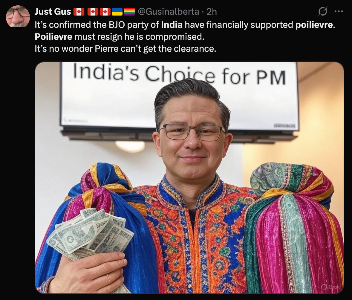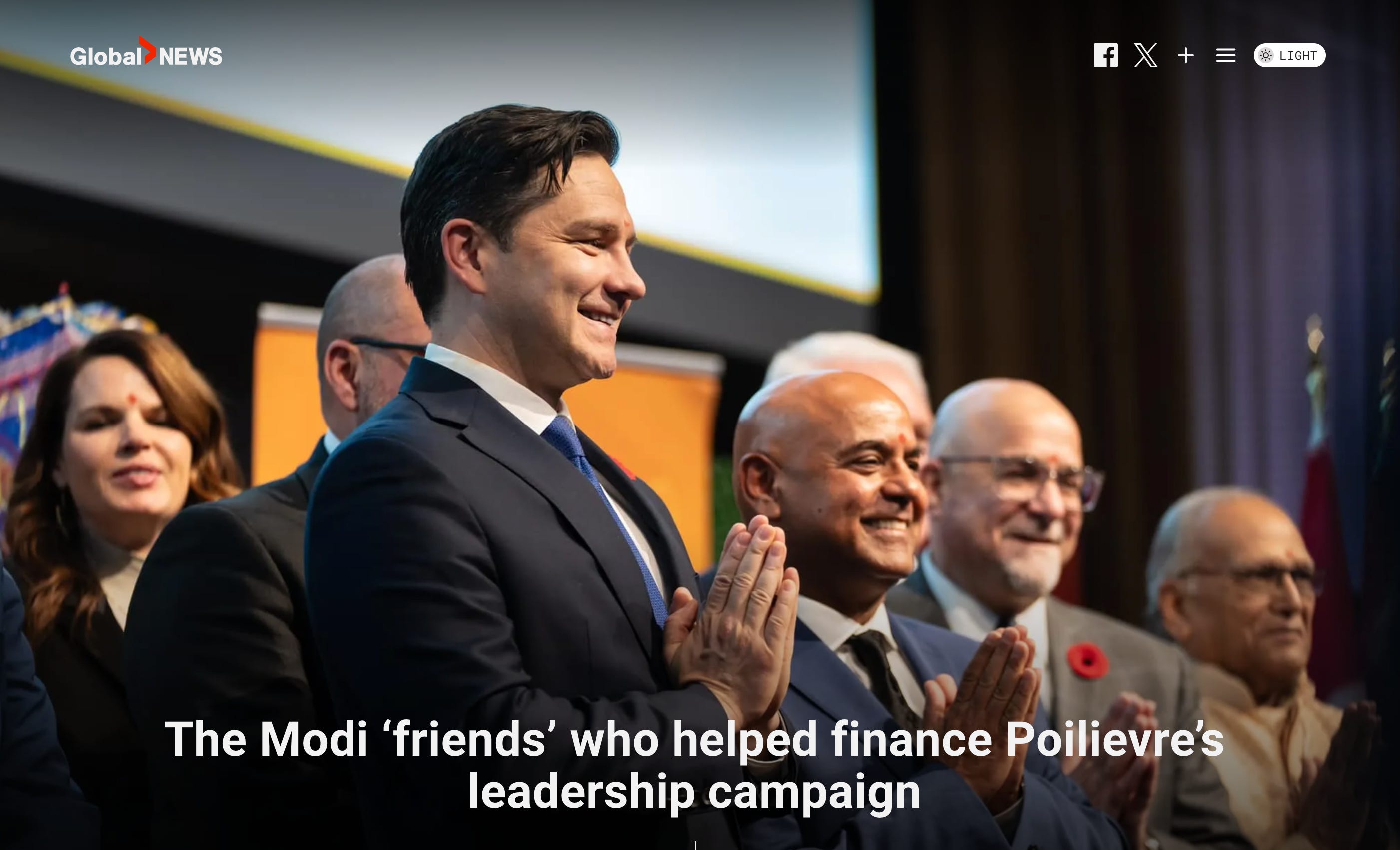 These aren’t casual connections. The Overseas Friends of BJP Canada may have dissolved, but its leaders now run other Indo-Canadian organizations that have featured Poilievre as a speaker. Tawatia, for his part, has called Poilievre “our dynamic leader” on social media, brushing off concerns with a shrug: “We like the Conservative Party, so what?” But this isn’t about party preference. It’s about foreign influence. The BJP isn’t just a political party—it’s a regime accused of transnational repression, election interference, and murder on Canadian soil. And Poilievre took their money, smiled for their cameras, and rode their support to the top of the Conservative Party.