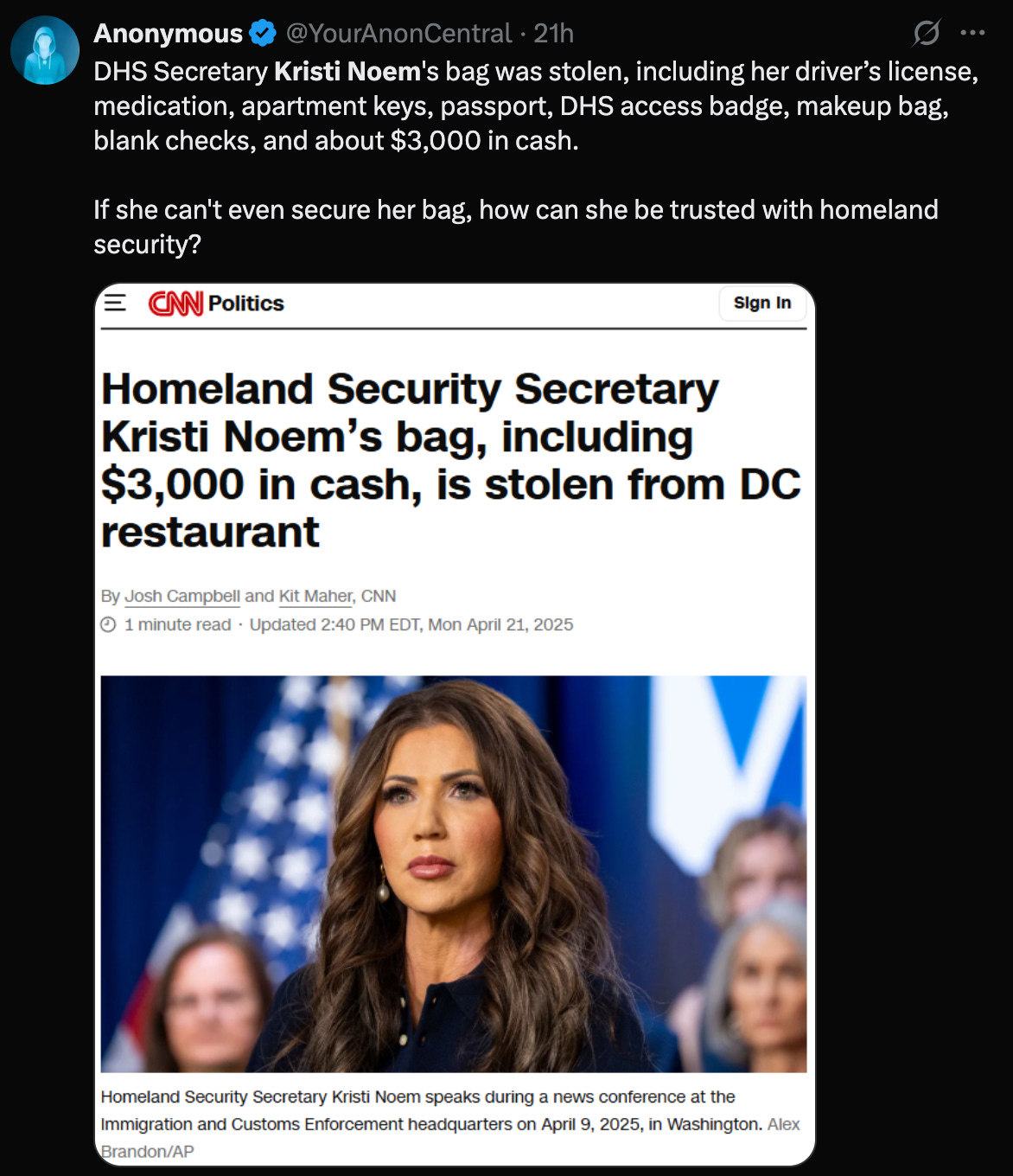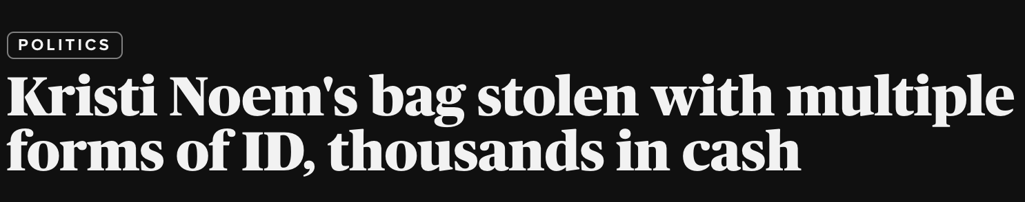 Kristi Noem, the head of Homeland Security, dining at a bustling D.C. restaurant last weekend, says she had her purse stolen, along with her ID, passport, DHS badge, and a cool $3,000 in cash.