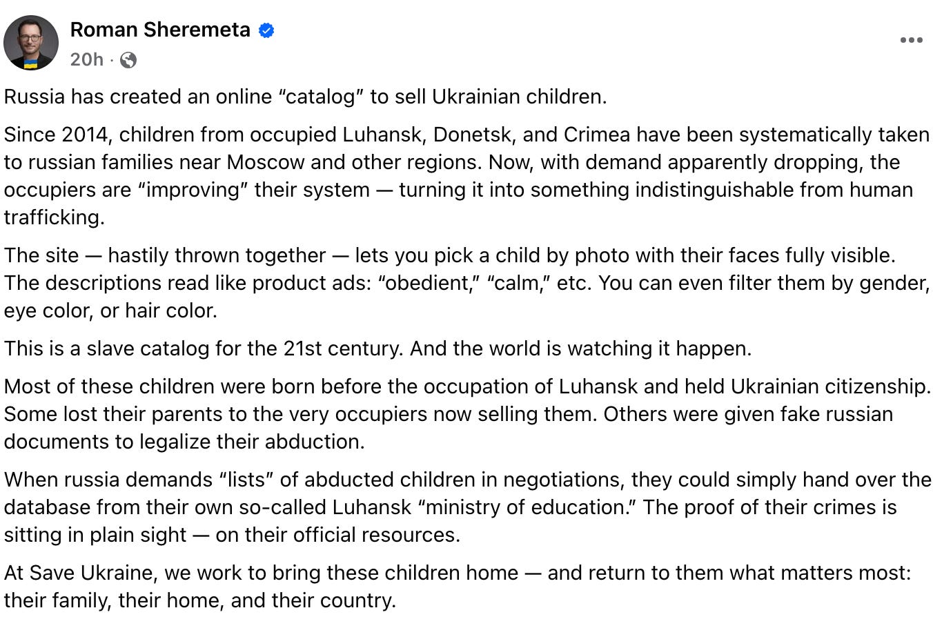 What amazes me about this story is how no one wants to include the kidnapping of 20 children as part of the ongoing invasion and genocide of the Ukrainian people. We talk more about every other shitty, pointless aspect of Russia’s invasion of Ukraine, but somehow the theft of 20k Ukrainian children (and now the trafficking of at least 300) gets a pass. The Trump Regime hasn’t mentioned it once because they’re busy protecting Donald Trump and his pedo pals from the Epstein Files.