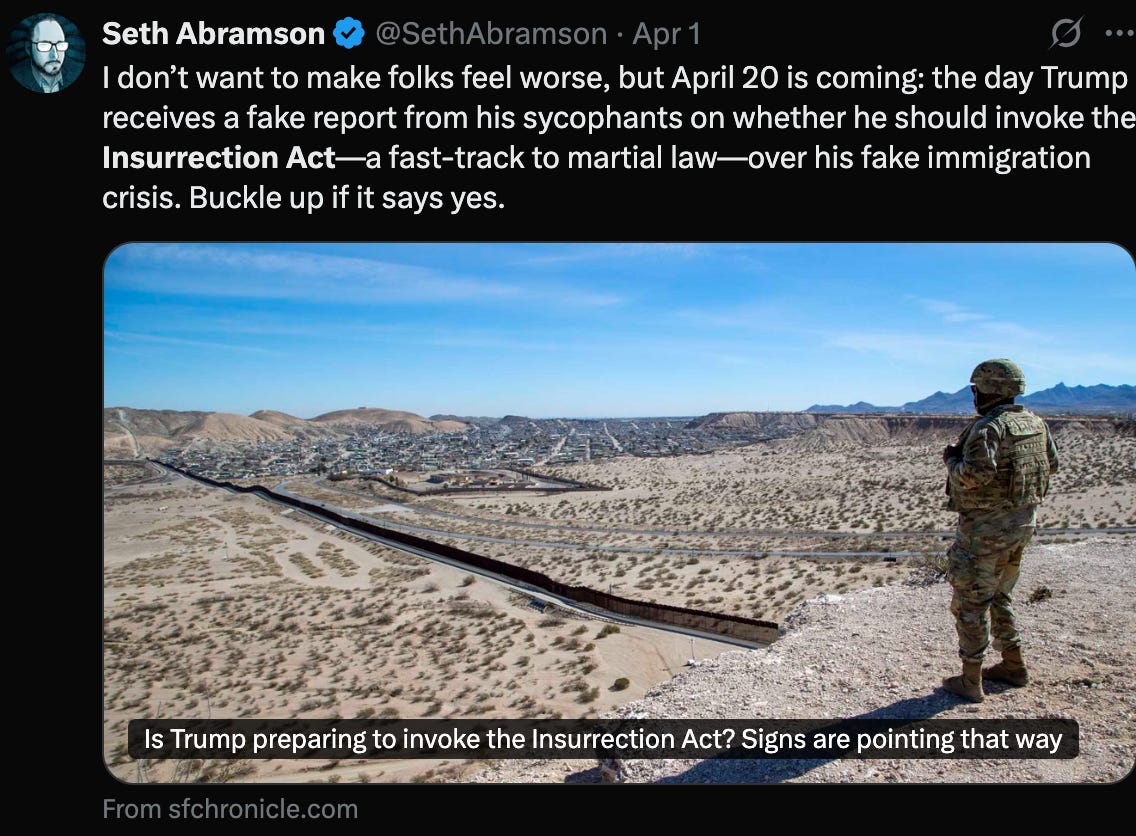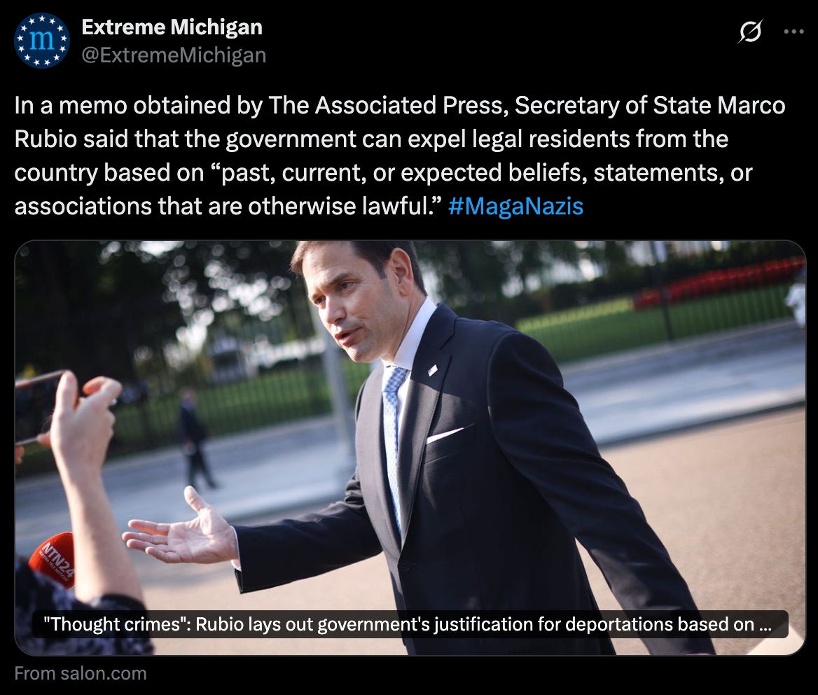 Let’s be blunt: this is fucked. The Trump administration is laying the groundwork to jail or deport people for their possible future thoughts or comments that might bruise Trump’s ego, tarnish his allies, or challenge his policies. The combination of Rubio’s memo and the Insurrection Act creates a playbook for authoritarianism: