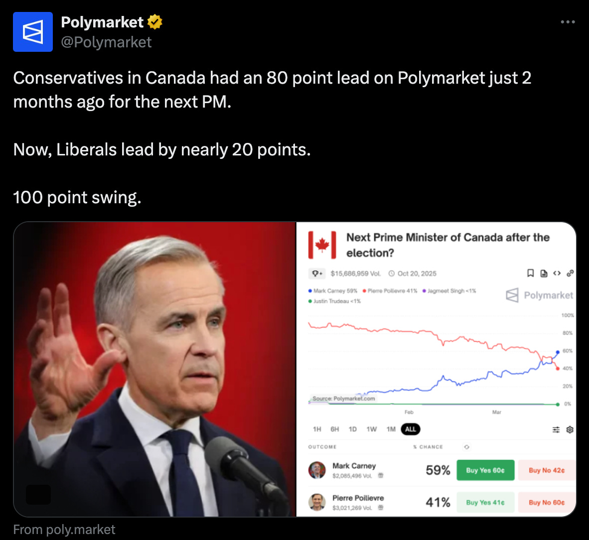 Then came the Polymarket poll massacre — a 100-point swing (yes, one hundred) straight into Liberal hands.