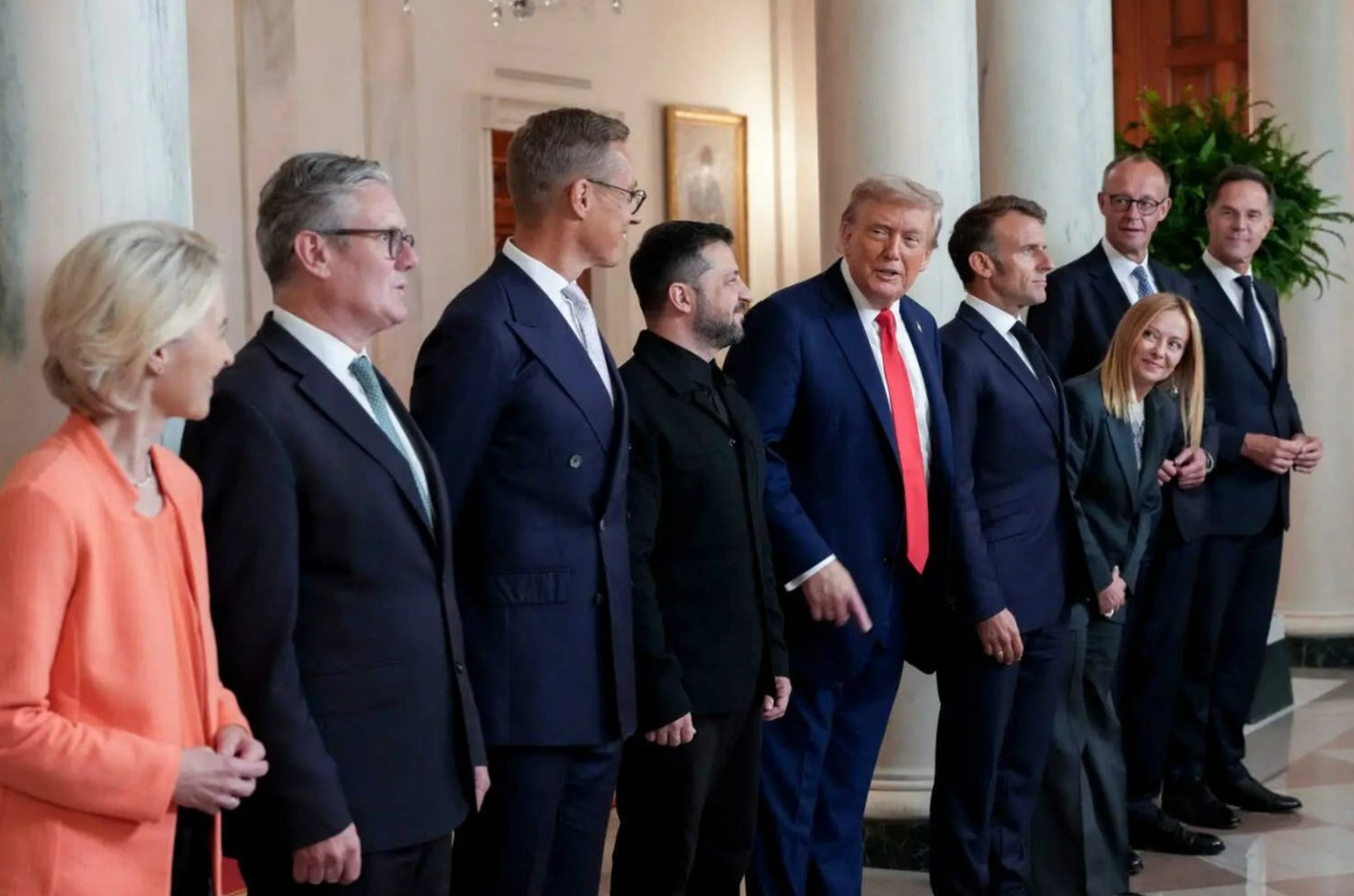 Who was there: Starmer, Macron, Merz, Meloni, Stubb, von der Leyen, and Rutte—documented by mainstream outlets and photo wires.