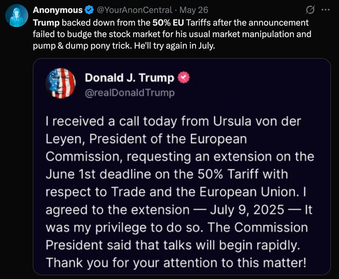 In May 2025, Trump threatened a 50% tariff on all EU imports.