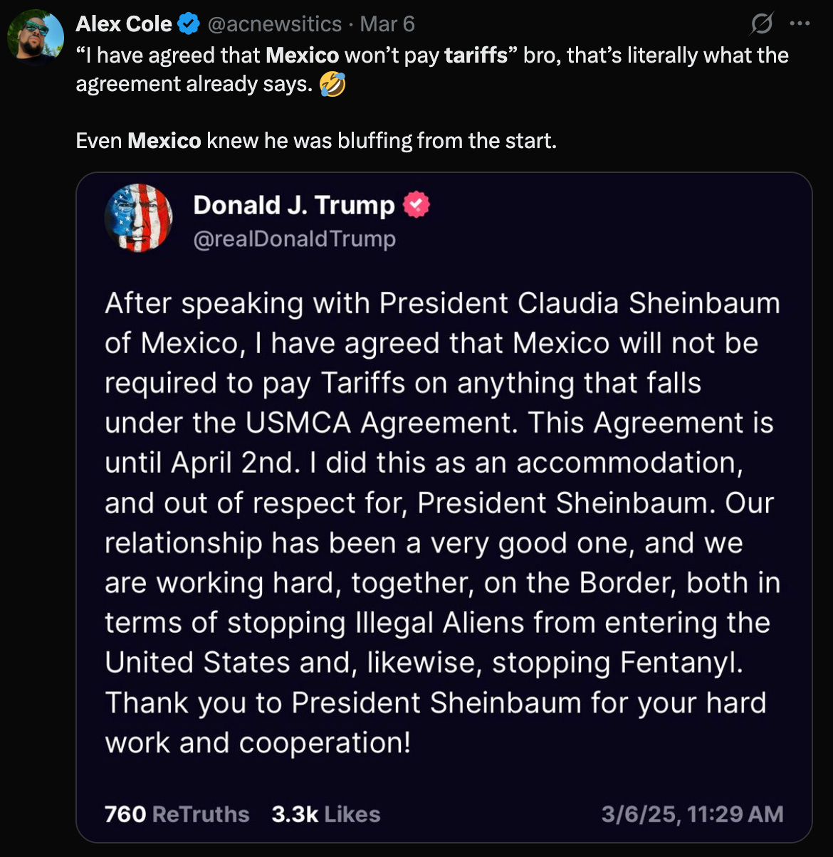 Except... oh wait. Canada got an exemption. So did Mexico. And the EU. And Australia. And South Korea. And Japan. And eventually, everyone else with a phone number.