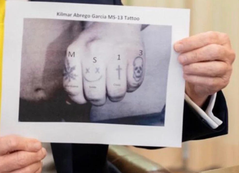 One of the most egregiously hilarious moments? Trump brandishing a photo of Kilmar Ábrego García, a U.S. resident wrongfully deported to El Salvador. Trump claimed the image showed Ábrego with “MS-13 tattooed onto his knuckles,” implying gang membership. But even a quick analysis shows this was nonsense. As CBS News documented, the image Trump posted was a Photoshop mash-up: the letters “M,” “S,” “1,” and “3” were digital overlays added to Ábrego’s actual tattoos, which included a leaf, a smiley face, a cross, and a skull. In reality, he doesn't have an MS-13 tattoo. Many observers immediately noticed that the letters looked typed, not inked – someone even quipped, “Have someone teach you about Photoshop.”